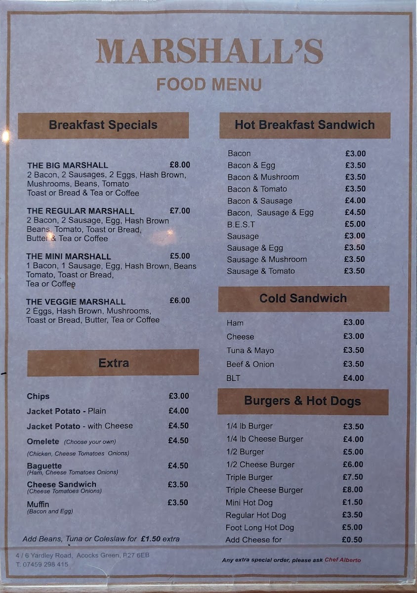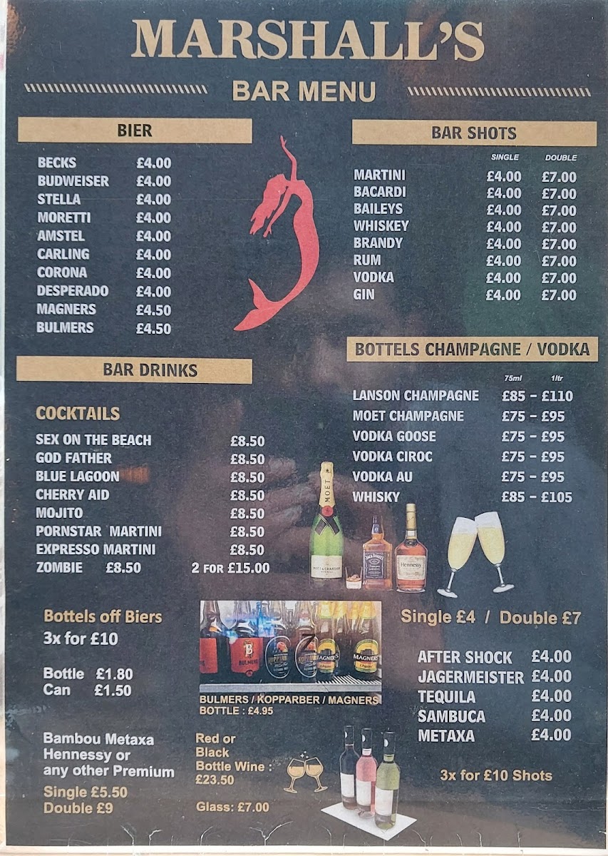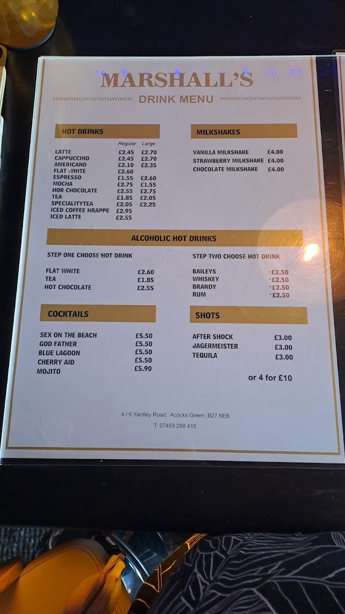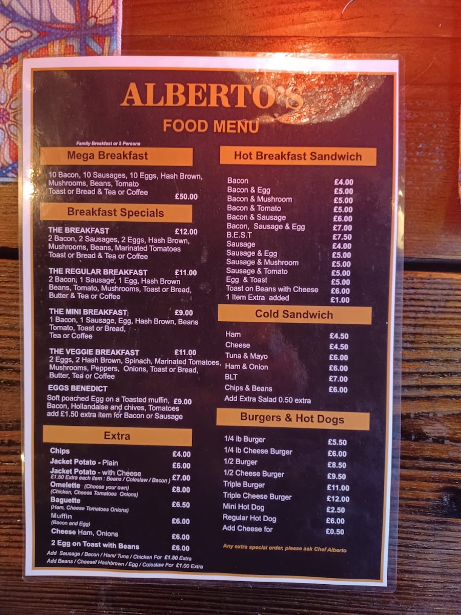 Alberto’s Coffeeshop & Bar in Acocks Green offers a diverse and satisfying menu catering to a wide range of tastes. For drinks, you can enjoy a selection of Becks, Budweiser, Stella Moretti, and Amstel beers, alongside a variety of bar shots such as Martini, Bacardi, and Baileys. For something more festive, their Lanson Champagne and Moet Champagne are perfect, or opt for premium Vodka Goose or Ciroc. Cocktail lovers can indulge in classics like Sex On The Beach, God Father, and Mojito, while those looking for a hot beverage can choose from Latte, Cappuccino, Americano, or an Espresso. Their milkshake range is a treat too, with Vanilla, Strawberry, and Chocolate Milkshake available.