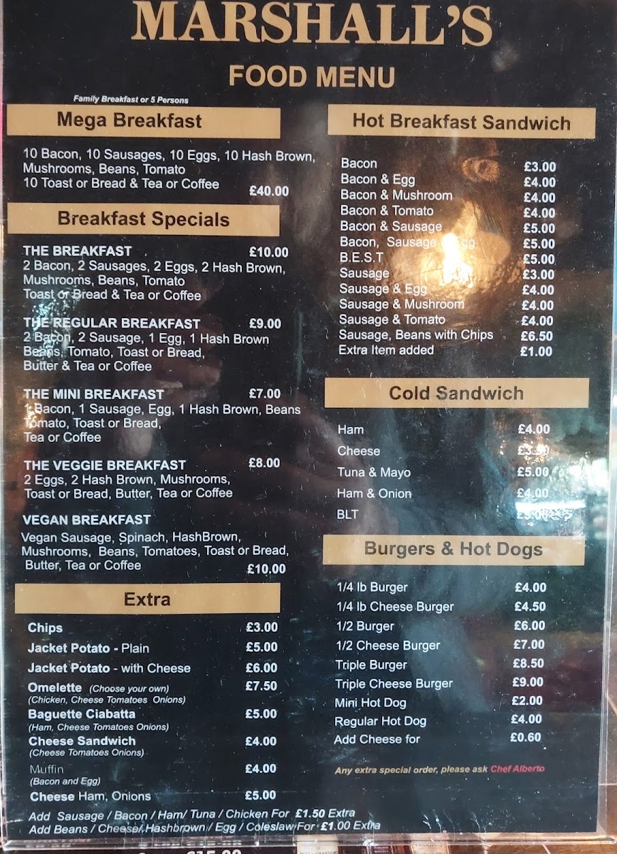 The restaurant also serves juicy Burgers & Hot Dogs, including the 1/4 Lb Burger and 1/2 Cheese Burger, with the Triple Burger being a standout. For sides, you can add Chips, a Jacket Potato, or even an Omelette. The Toastie/Panini/Sandwich selection features combinations like Bacon & Egg, Bacon & Cheese, and Cheese & Ham. Additionally, there are indulgent treats such as Luxury Hot Chocolate and Gingerbread Latte, offering a cozy way to finish your meal.